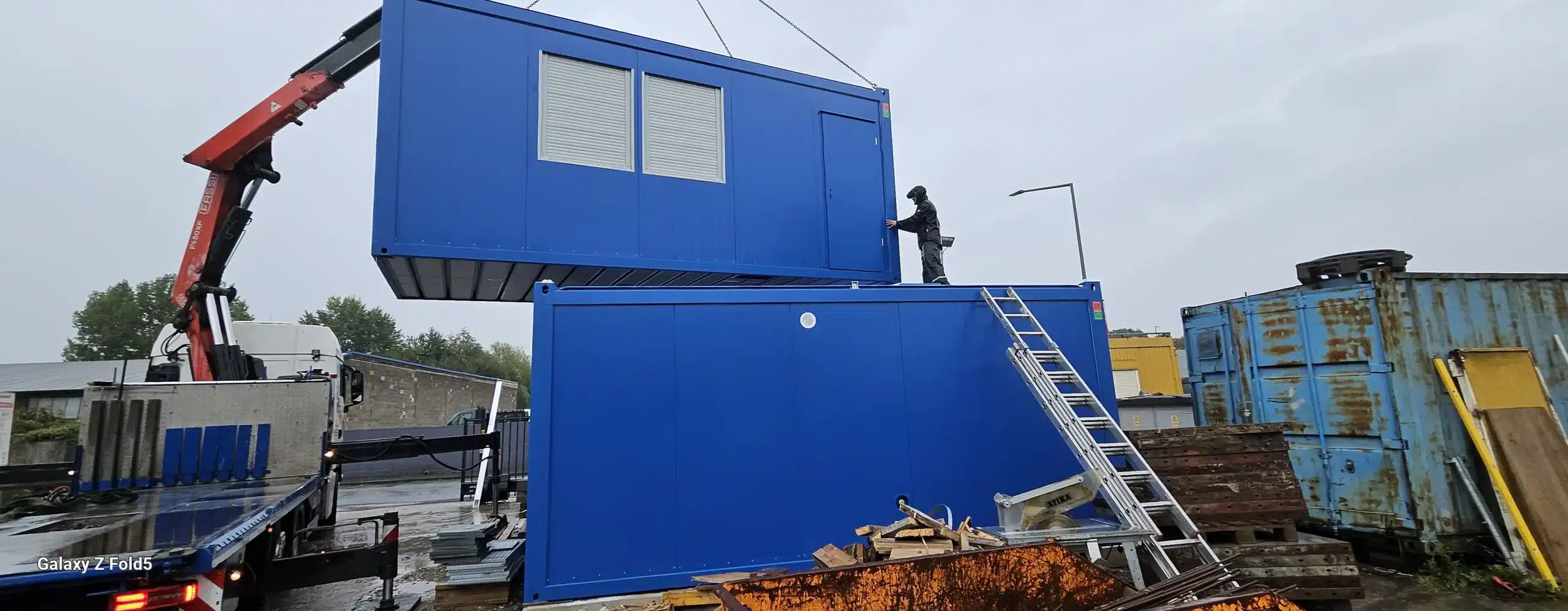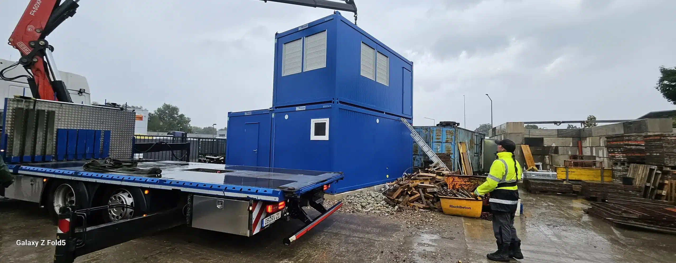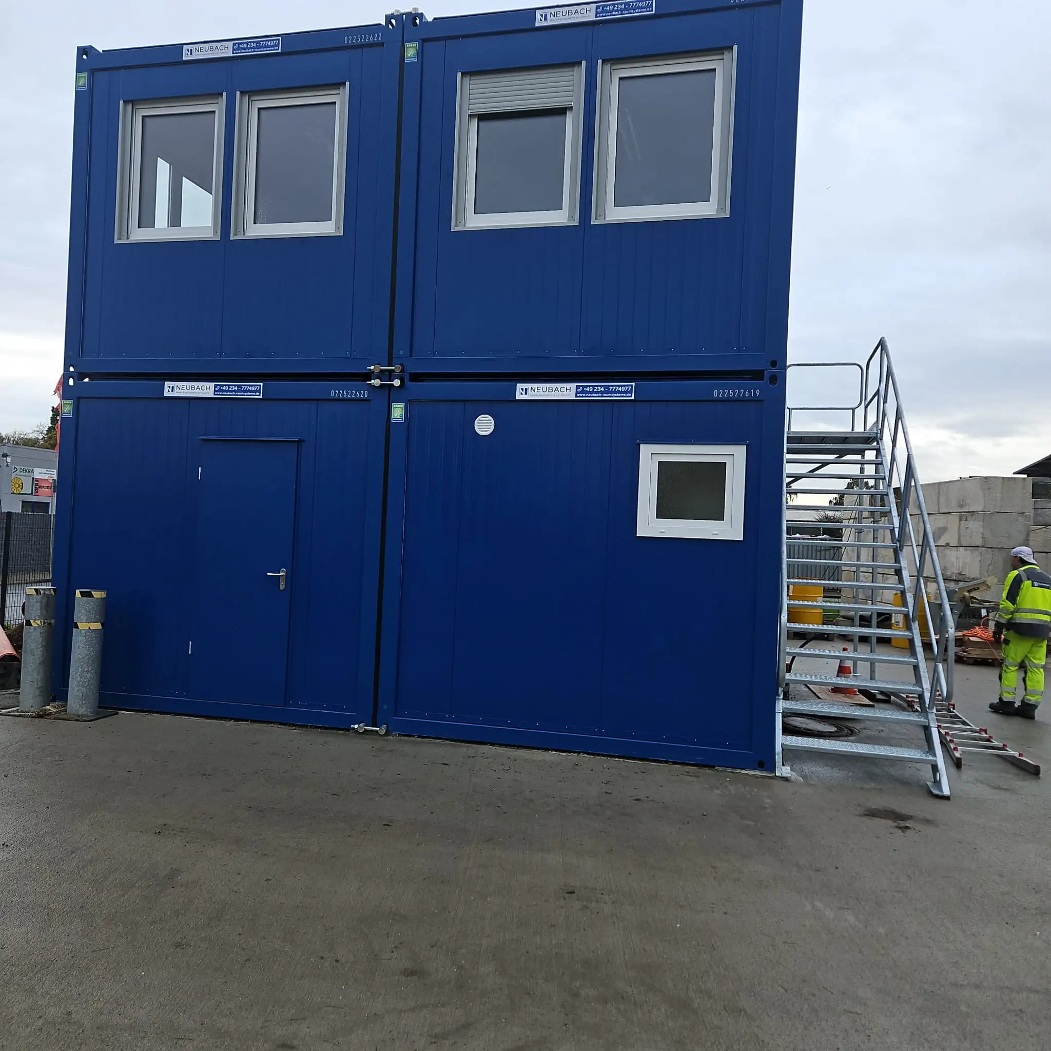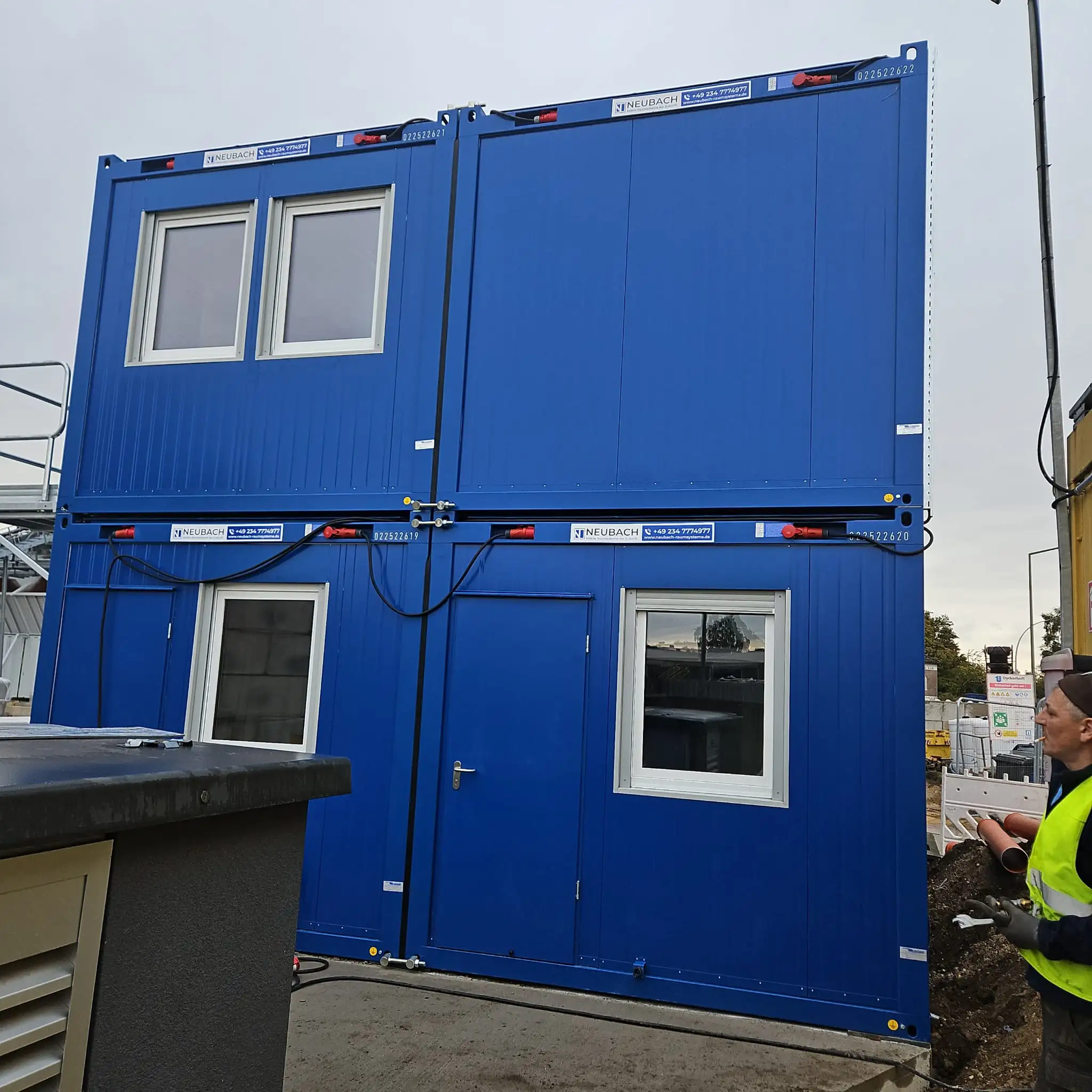 Neubach lieferte und montierte eine vierteilige Containeranlage mit einer Raumhöhe von 2.500 mm. Die Anlage umfasst einen Bürocontainer XL sowie drei Container mit vollwertiger Sanitärausstattung. Im unteren Bereich befinden sich die Sanitärräume, der obere Teil dient als Aufenthalts- und Pausenraum für die Mitarbeiter. Die Ausführung erfolgte in RAL 5010 Enzianblau, inklusive hochwertiger Wärmedämmung nach GEG.