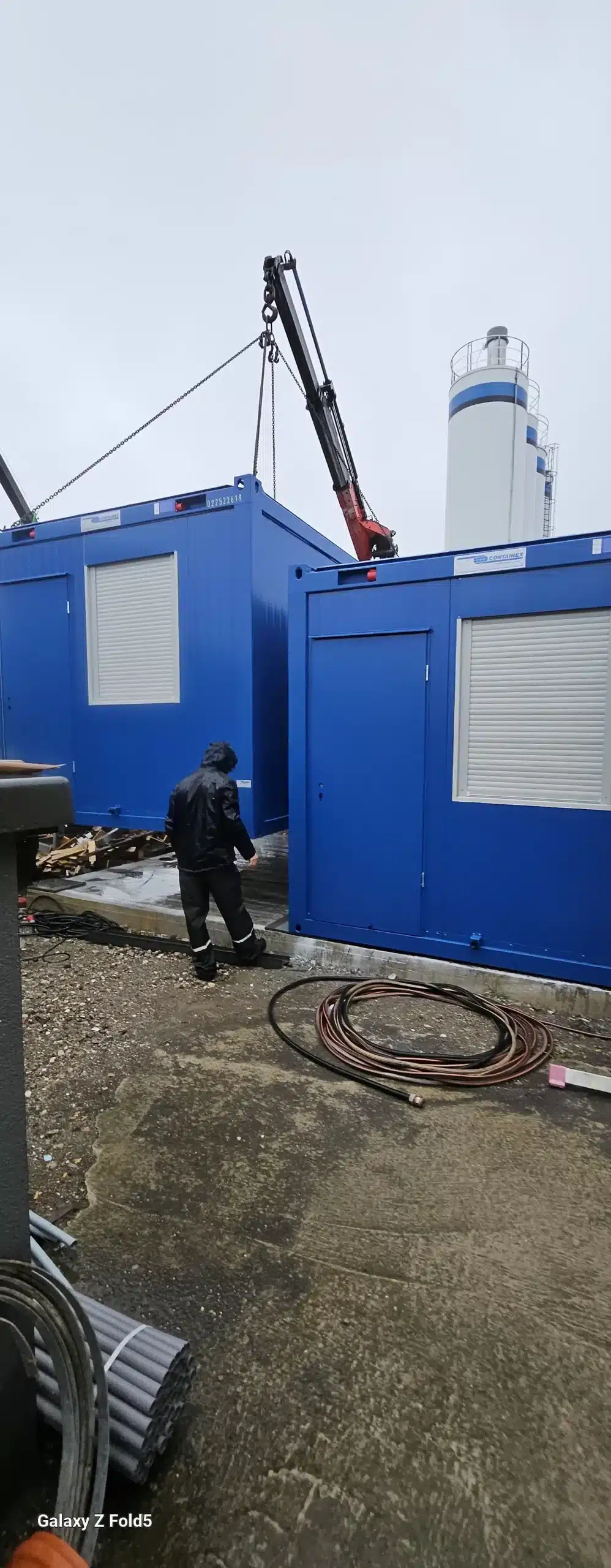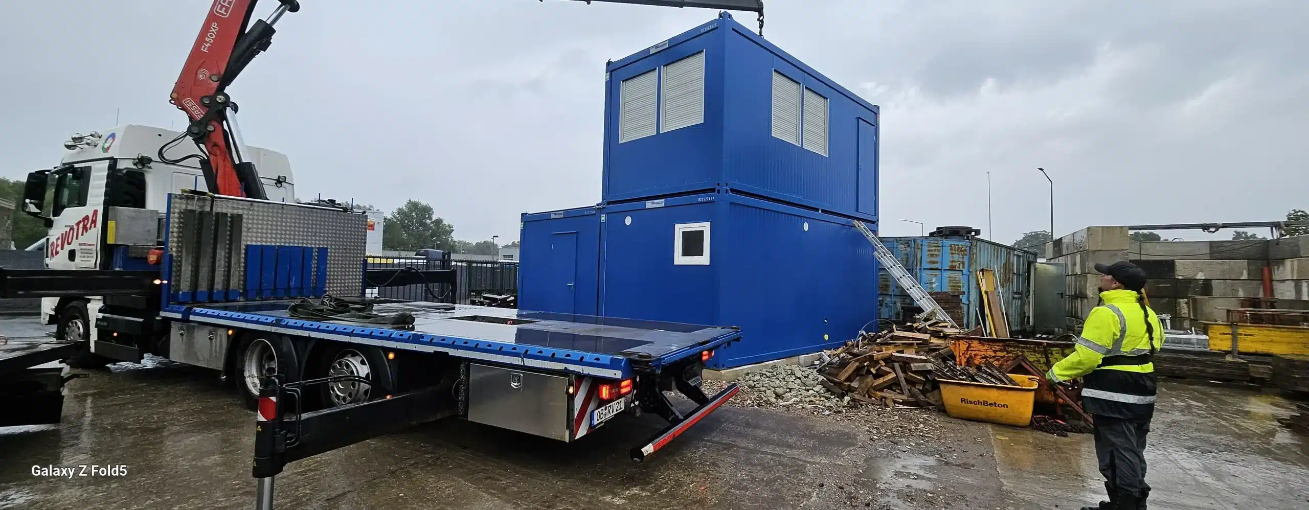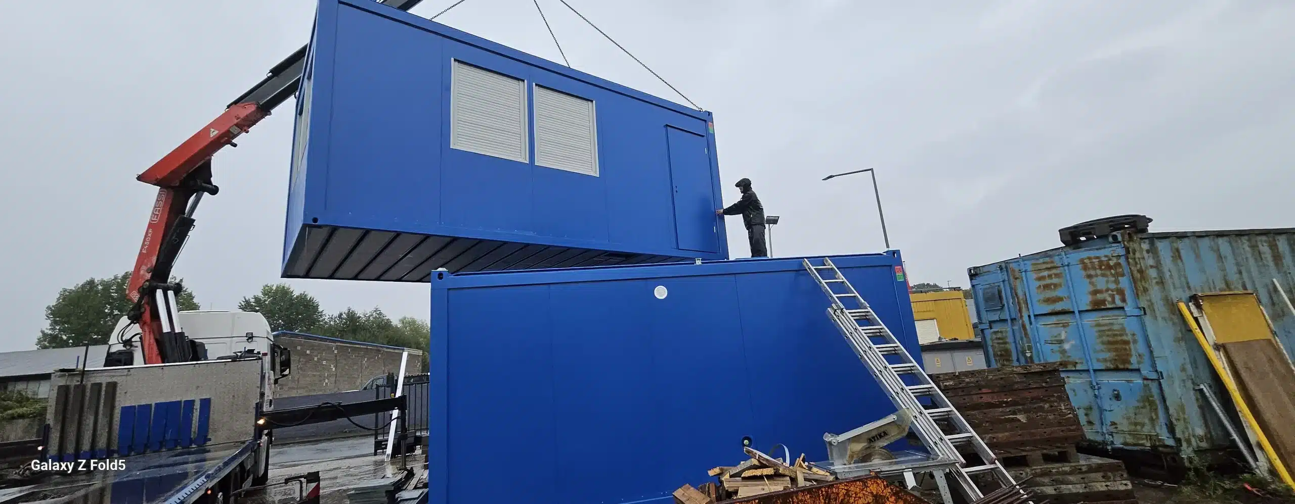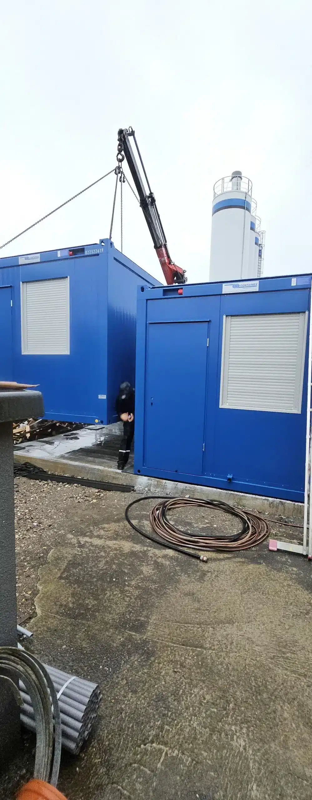 Neubach lieferte und montierte eine vierteilige Containeranlage mit einer Raumhöhe von 2.500 mm. Die Anlage umfasst einen Bürocontainer XL sowie drei Container mit vollwertiger Sanitärausstattung. Im unteren Bereich befinden sich die Sanitärräume, der obere Teil dient als Aufenthalts- und Pausenraum für die Mitarbeiter. Die Ausführung erfolgte in RAL 5010 Enzianblau, inklusive hochwertiger Wärmedämmung nach GEG.
