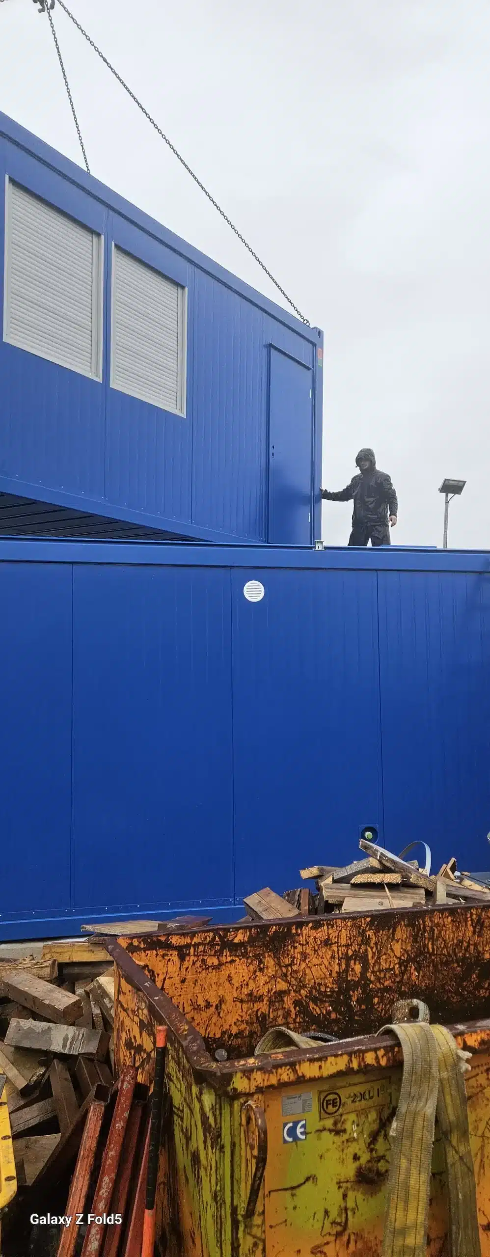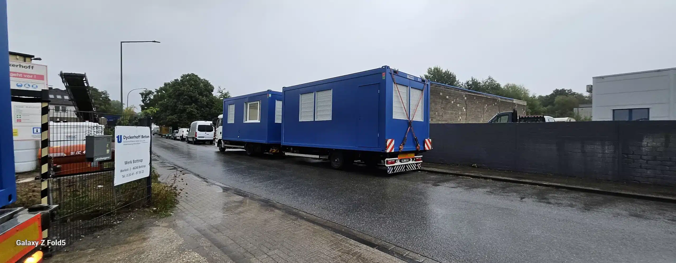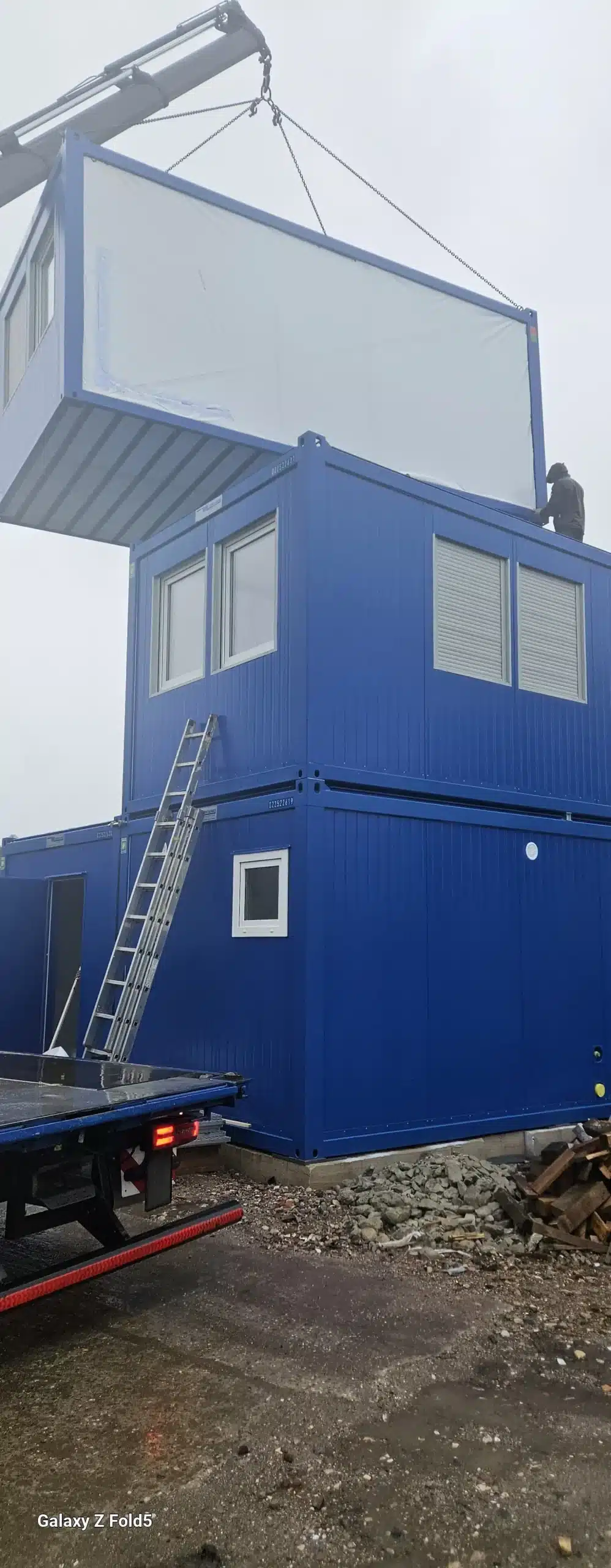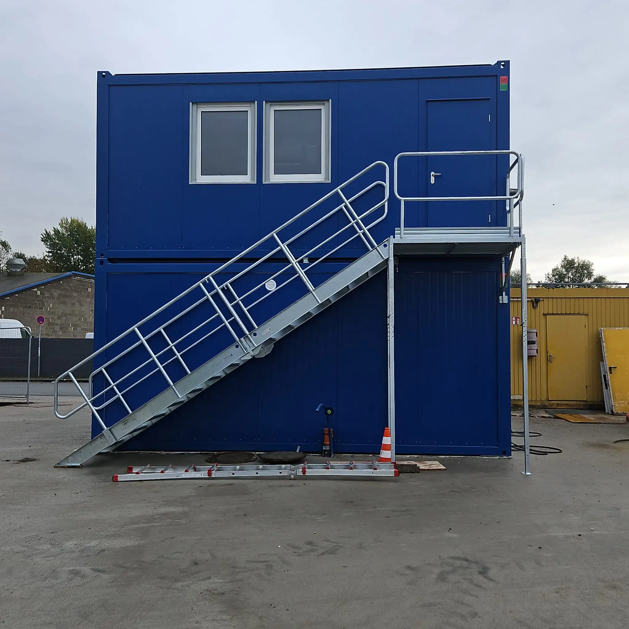 Neubach lieferte und montierte eine vierteilige Containeranlage mit einer Raumhöhe von 2.500 mm. Die Anlage umfasst einen Bürocontainer XL sowie drei Container mit vollwertiger Sanitärausstattung. Im unteren Bereich befinden sich die Sanitärräume, der obere Teil dient als Aufenthalts- und Pausenraum für die Mitarbeiter. Die Ausführung erfolgte in RAL 5010 Enzianblau, inklusive hochwertiger Wärmedämmung nach GEG.