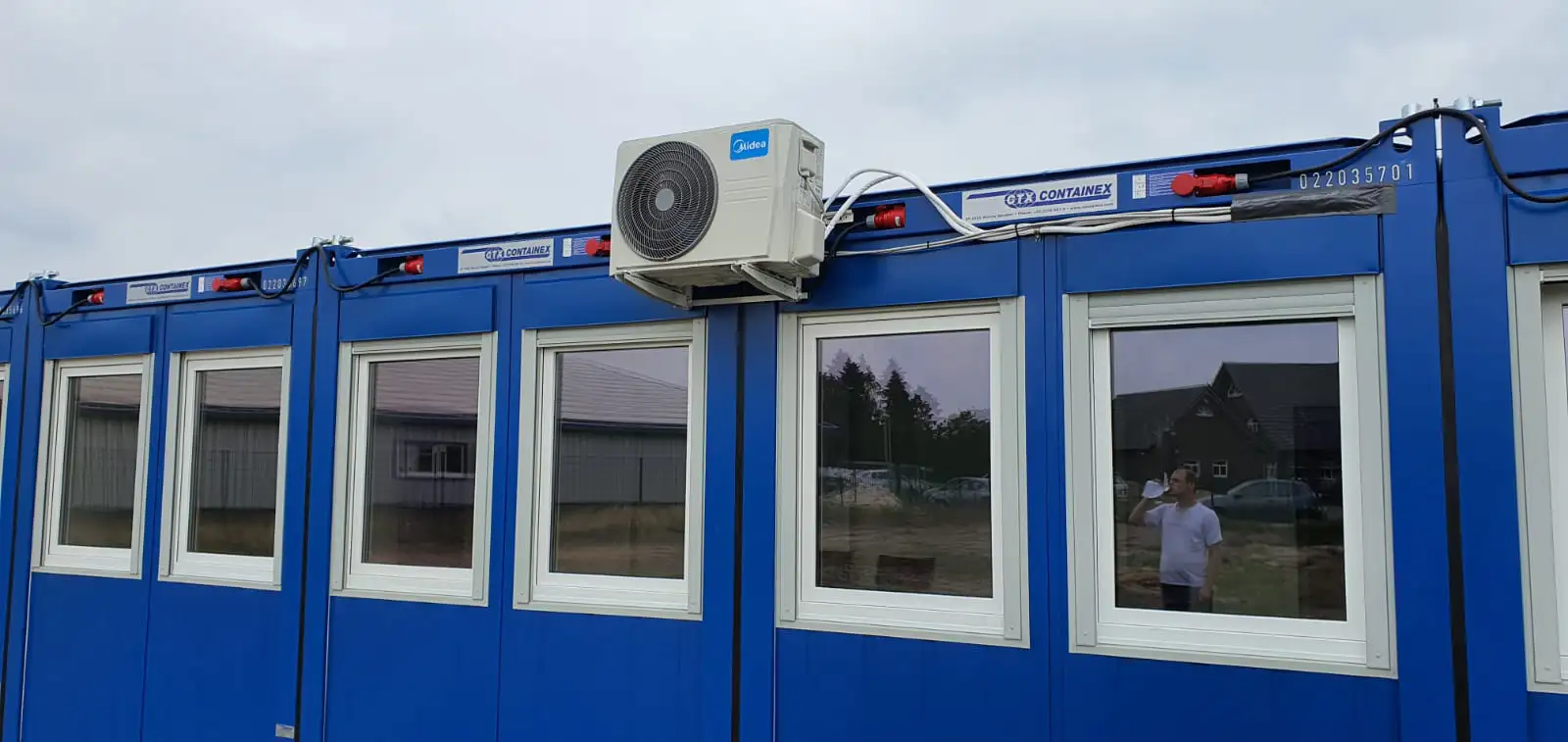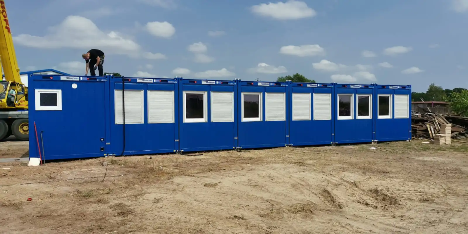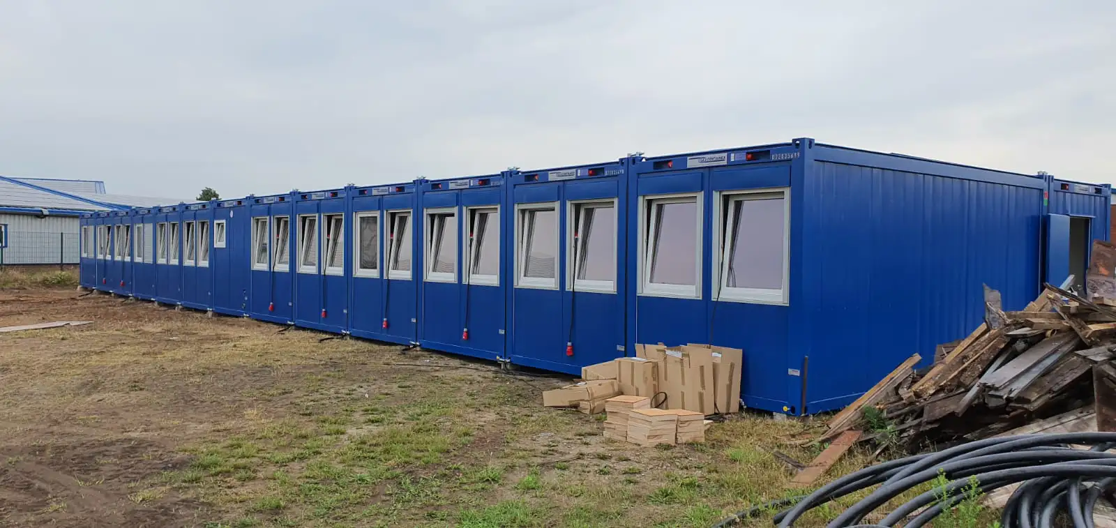 Die Lösung besteht aus insgesamt 17 Containermodulen, darunter mehrere Großcontainer mit 24 Fuß Länge sowie ein eigenständiger Sanitärbereich. Die Ausführung in RAL 5010 (Enzianblau) passt sich dem firmeneigenen Erscheinungsbild an und überzeugt durch Funktionalität & Design.