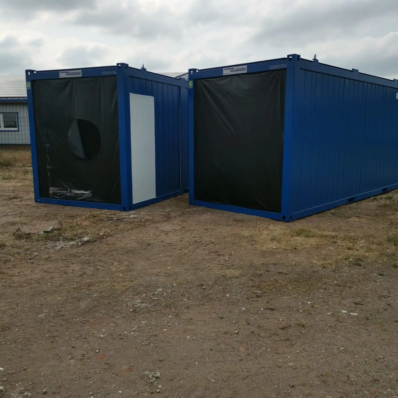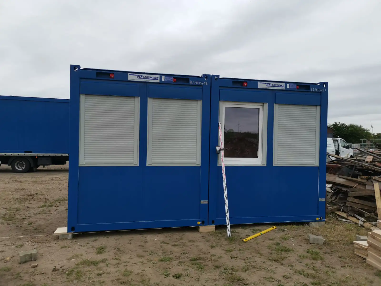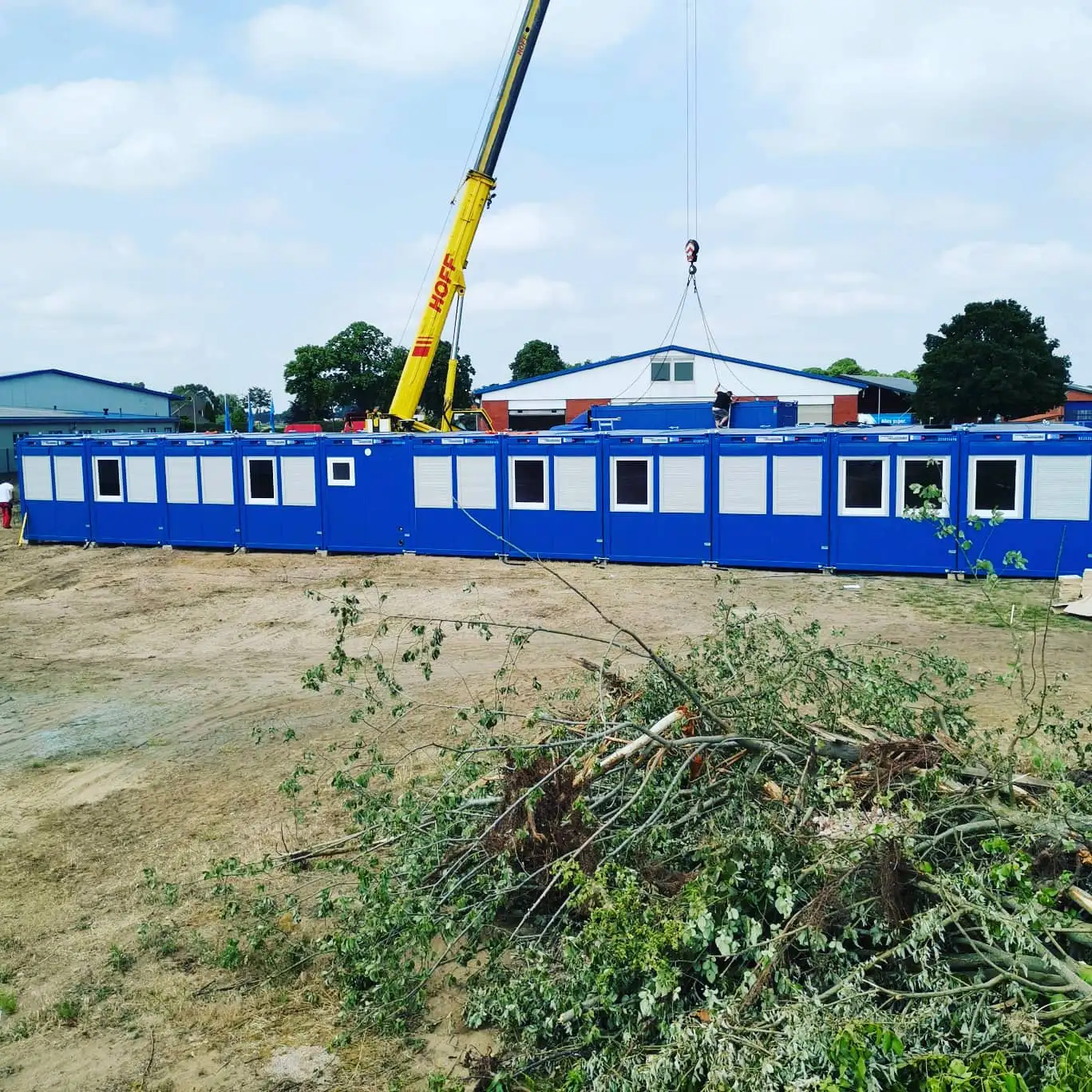Die Lösung besteht aus insgesamt 17 Containermodulen, darunter mehrere Großcontainer mit 24 Fuß Länge sowie ein eigenständiger Sanitärbereich. Die Ausführung in RAL 5010 (Enzianblau) passt sich dem firmeneigenen Erscheinungsbild an und überzeugt durch Funktionalität & Design.