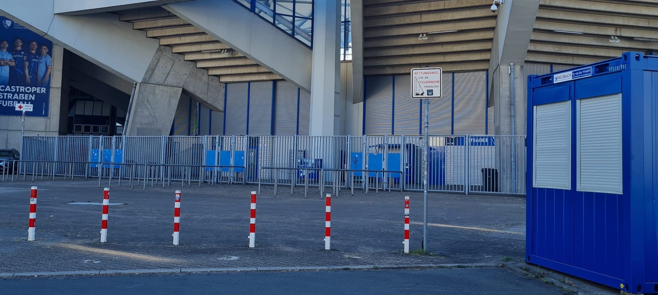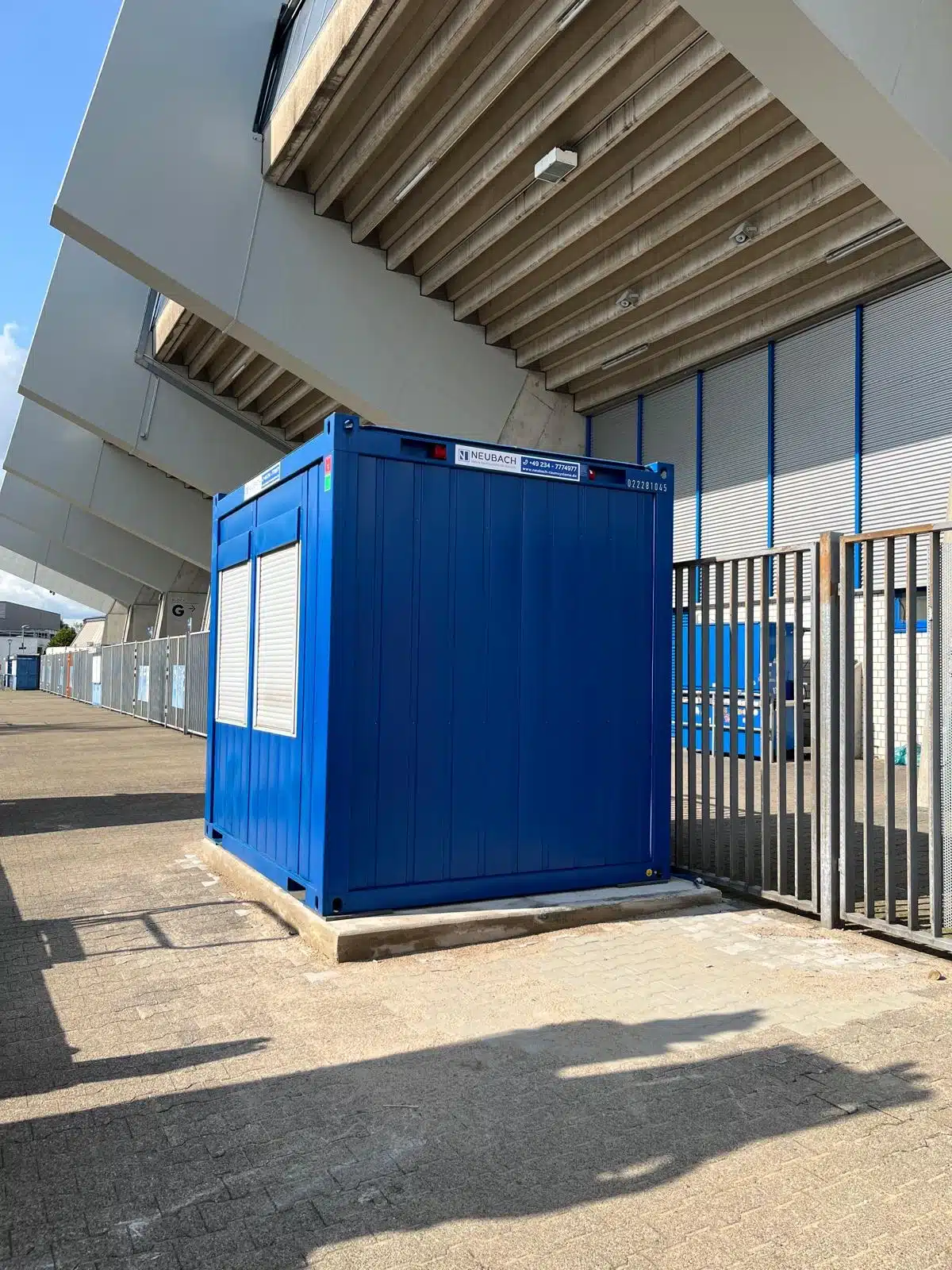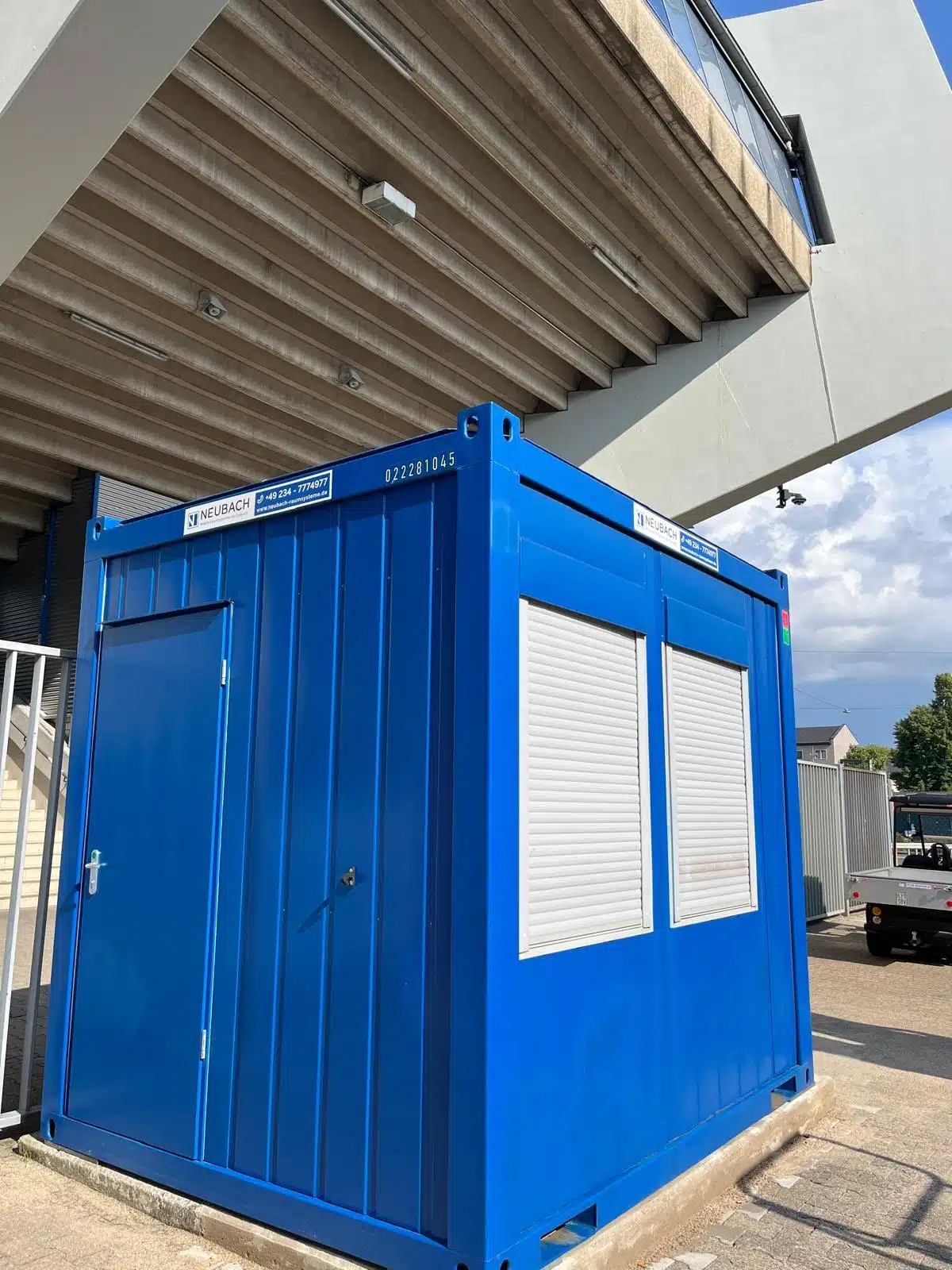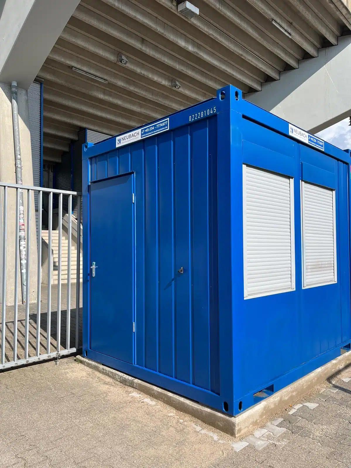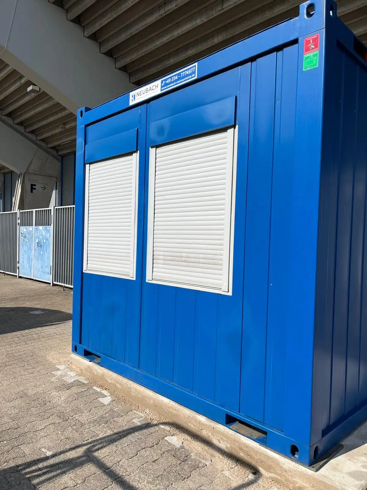 Neubach stellte einen 10-Fuß-Raumcontainer bereit, der speziell zum Kassenhäuschen umgebaut wurde. Der Container erhielt zwei Fenster als Durchspreche und bietet eine kompakte, sofort einsatzbereite Lösung für den Ticketverkauf des VfL Bochum.